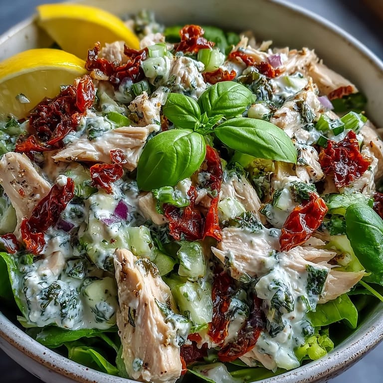 Save to Pinterest Last summer, I found myself staring at a rotisserie chicken and a jar of sun-dried tomatoes, wondering what magic I could conjure for lunch. The first time I tossed this salad together, my kitchen filled with the bright scent of fresh basil and garlic, and I knew I had stumbled onto something special.