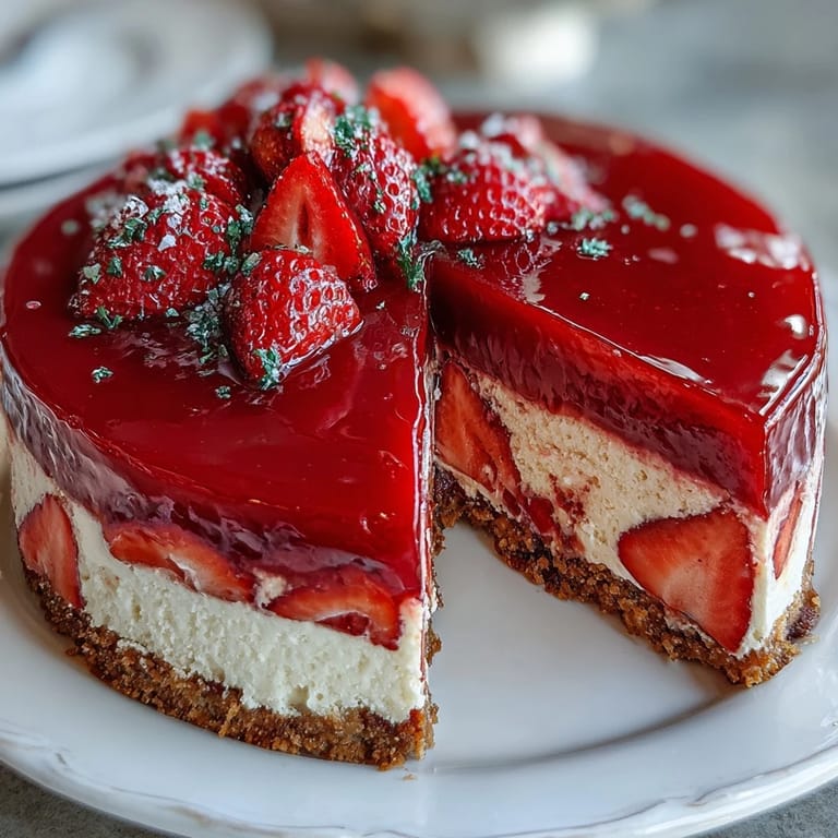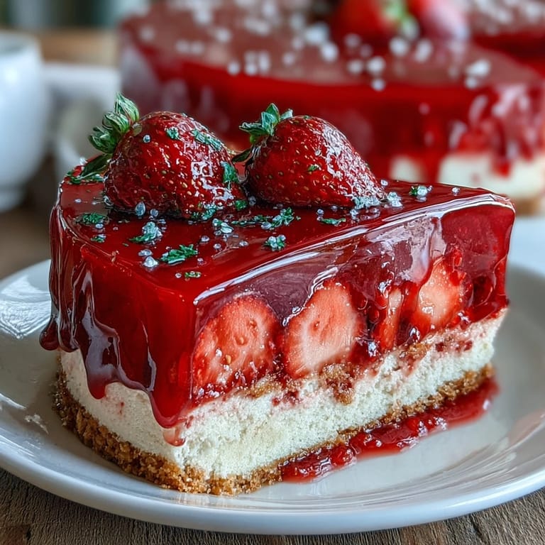 I made this for my partner's birthday and watched their face when they realized the whole top layer was just strawberries suspended in glossy perfection. What started as my nervous energy in the kitchen turned into this moment where they took a forkful and closed their eyes, and suddenly all the timing and the temperature checks and the careful folding felt completely worth it. That's when I understood this cake wasn't just about technique—it was about creating a tiny, edible moment of celebration.